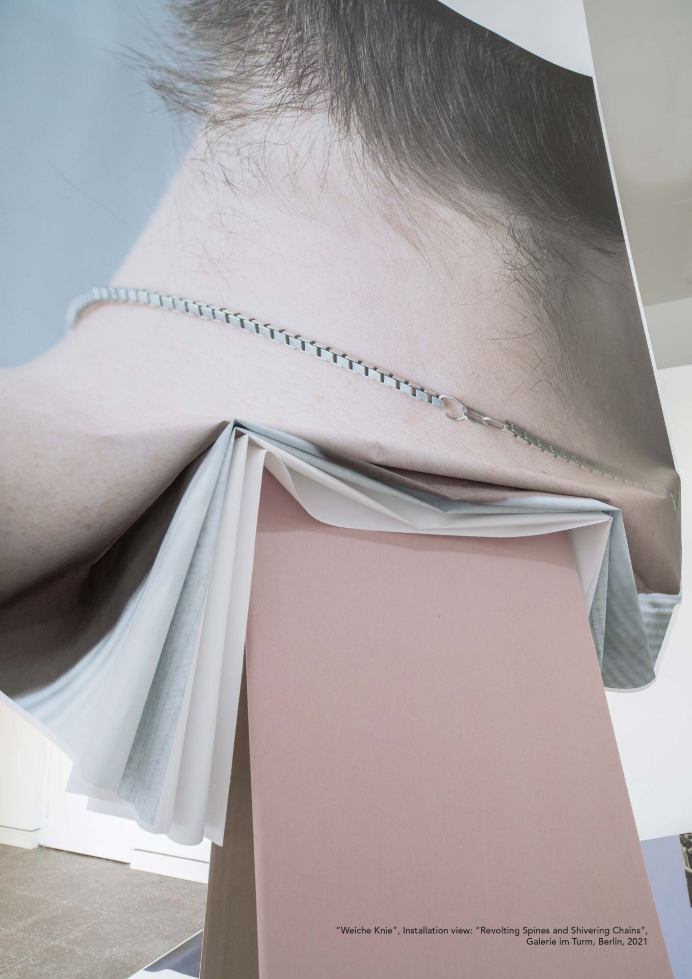 Weiche Knie (Slabá kolena) zahrnuje mé vlastní fotky, ale také materiál z mého probíhajícího výzkumu queer a feministických archivů. Ty dokumentují průběh historického násilí ve spojení s instituční léčbou, ale také s prvními odporovými hnutími a iniciativami, jako praktiky léčby svépomocí, jako byla feministická léčebná centra v 70. letech 20. století, návody první pomoci při policejním násilí, nebo první použití bidetů pro zabránění nechtěných těhotenství. Ve svých fotografiích praktikuji performativní přístup, ve kterém rozvíjím a inscenuji gesta s přáteli a kolegy. Prozkoumávají například otázku, jaké doteky a pohyby potřebujeme ve zranitelných chvílích. V instalaci se tato gesta znovu rozpohybují tištěnými materiály, ale i aranží sádrových desek. Weiche Knie se ptá, po jakých vztazích toužíme, abychom umožnili i jiné formy poskytování a obdržování péče, a také co to znamená mít v každodenním životě vlastní názor.